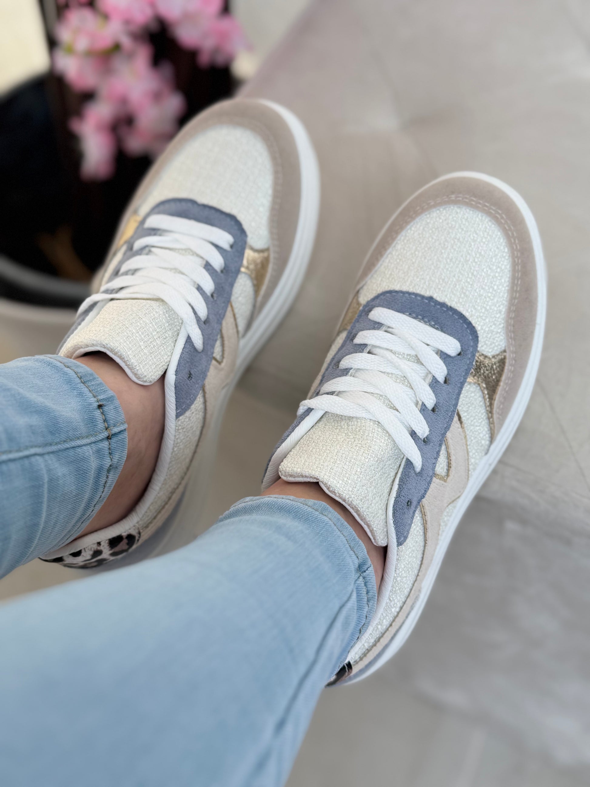 Baskets bleu à détails nacrés, beige et léopard – confort et style au quotidien
