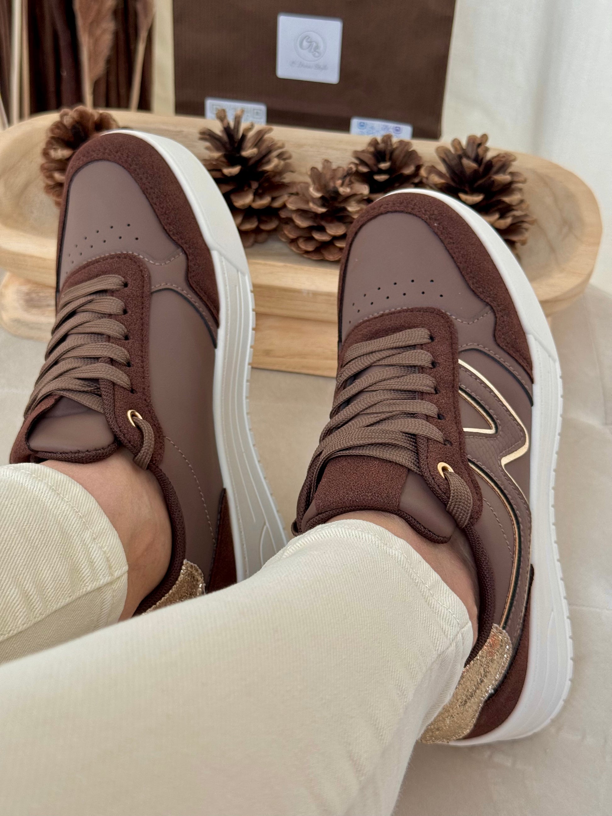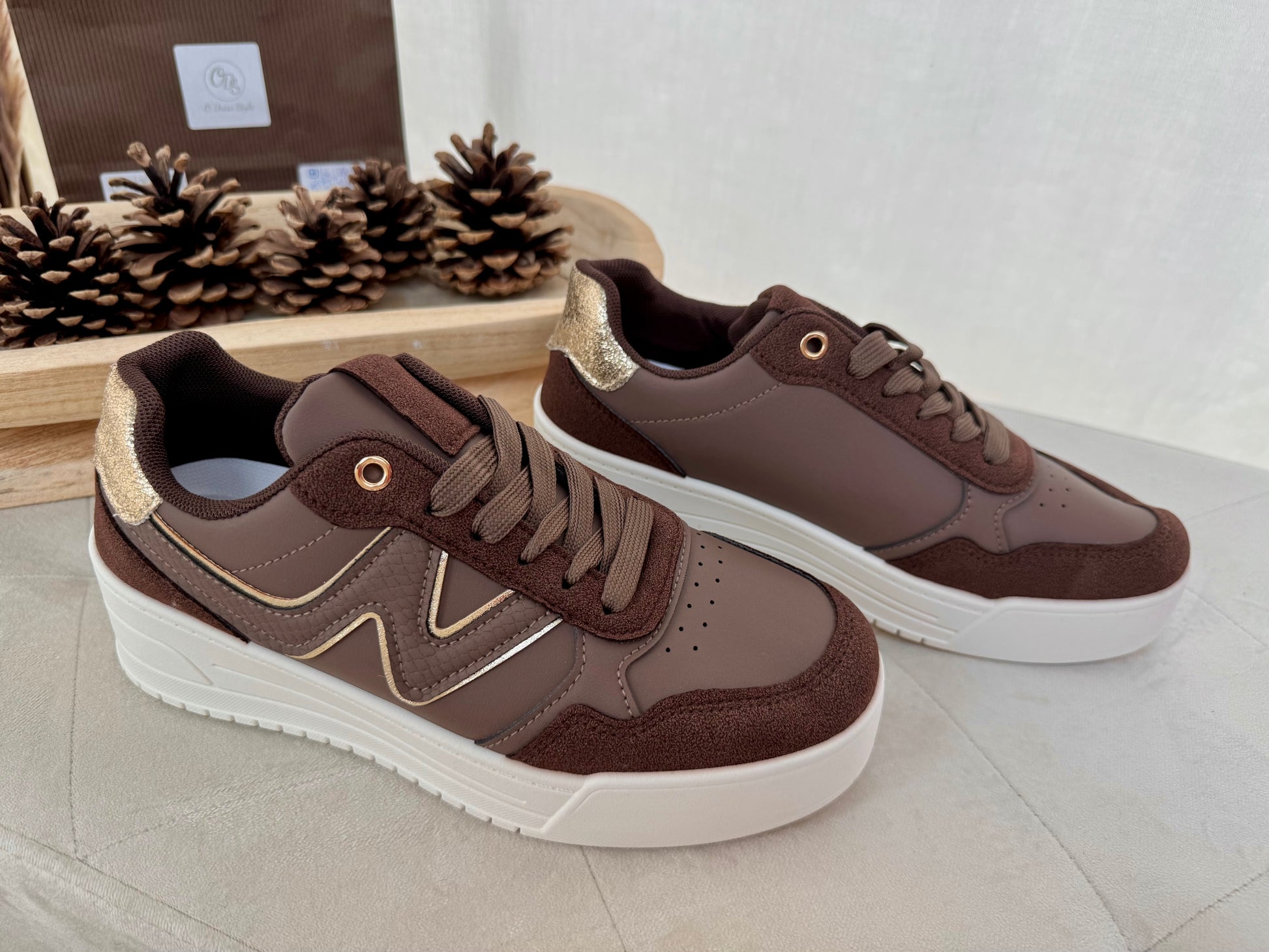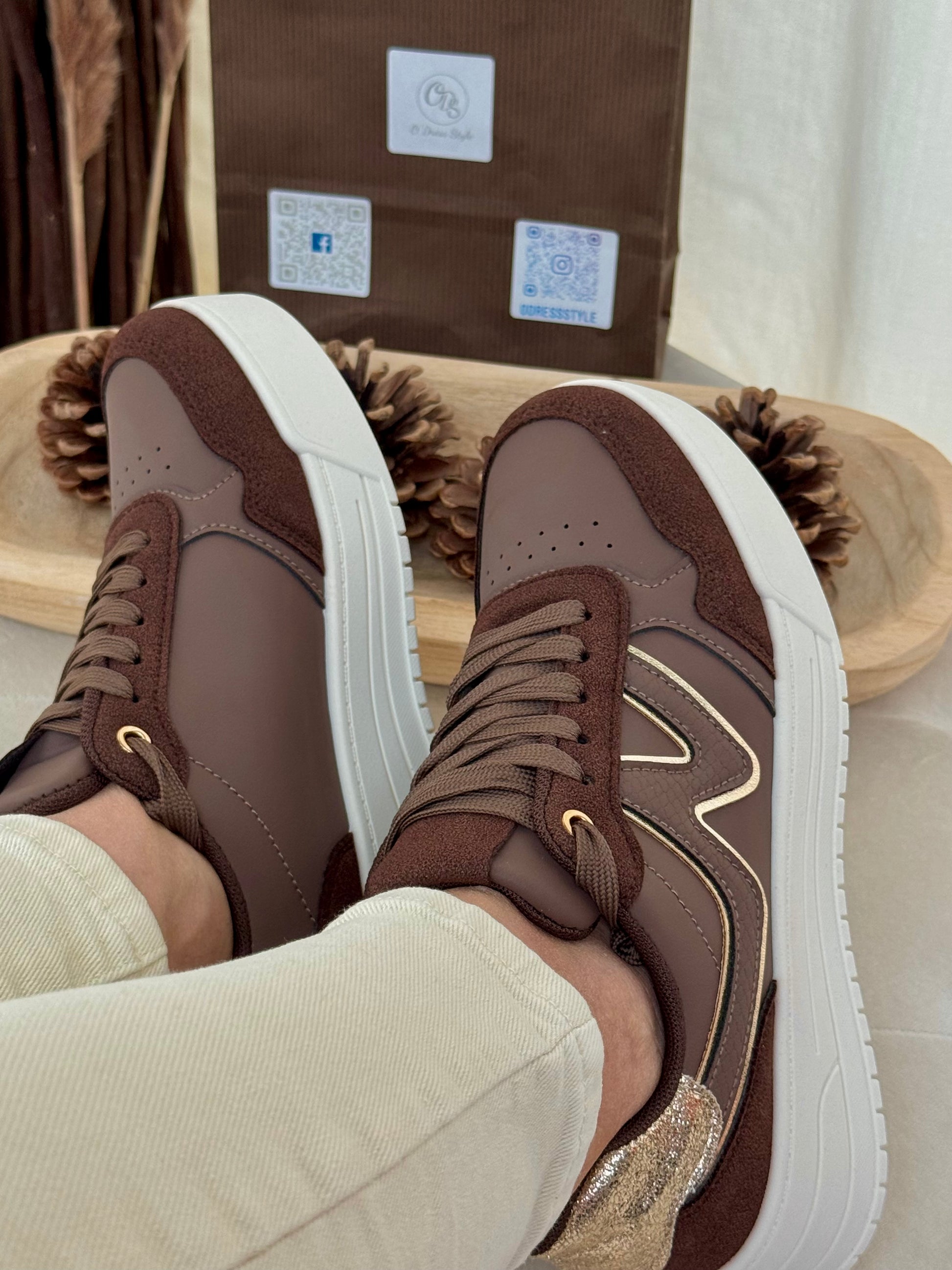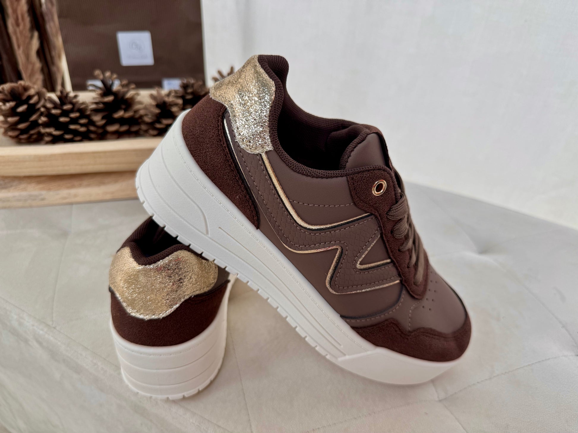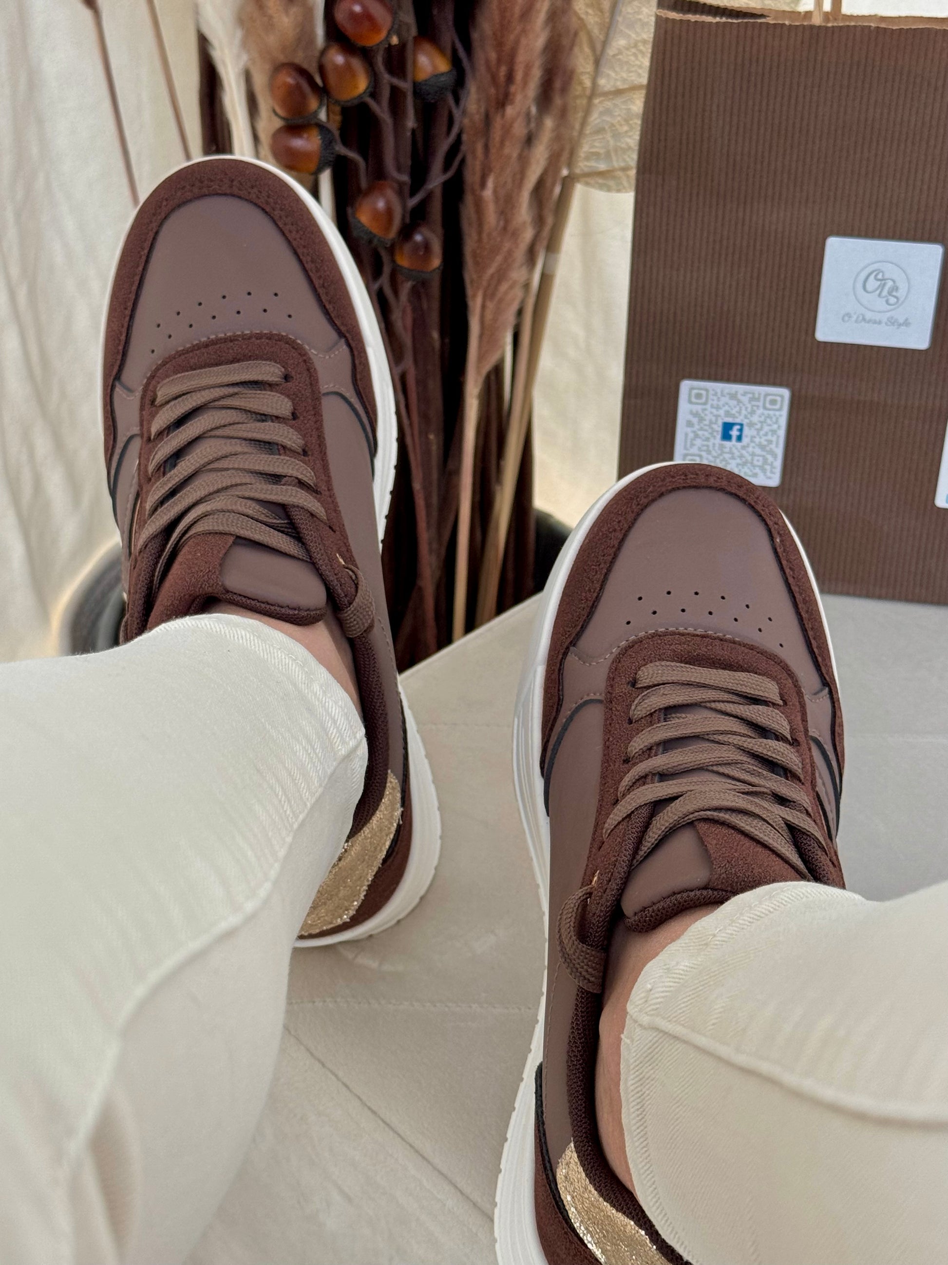 Craquez pour ces baskets chocolat et doré, la paire parfaite pour sublimer vos looks avec confort et féminité.