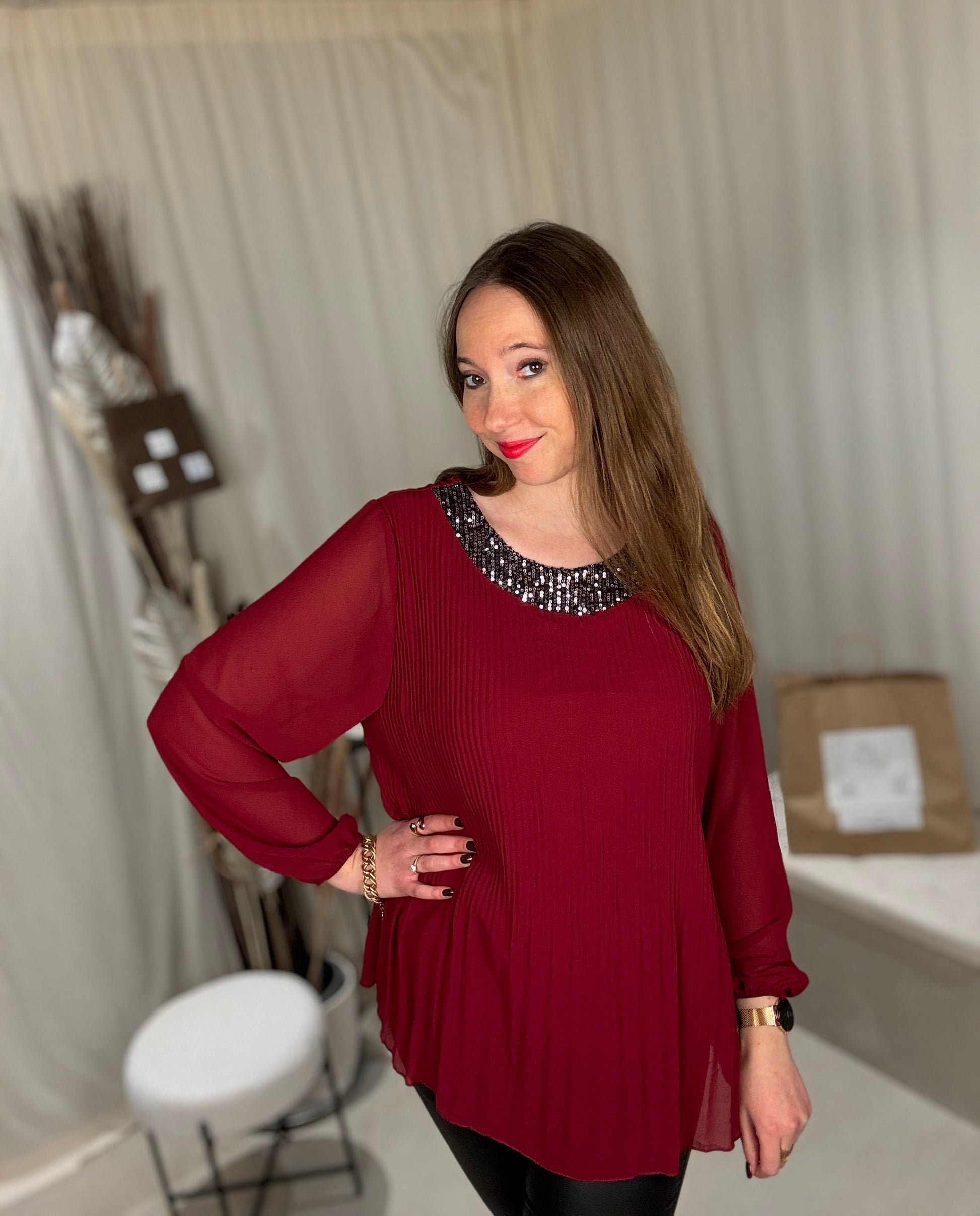 Pourquoi vous allez l’adorer : Cette blouse combine sophistication et confort. Les plissés apportent un mouvement élégant et féminin, tandis que les sequins ajoutent une touche de glamour qui capte la lumière. Polyvalente et facile à porter, elle devient rapidement la pièce phare de vos tenues pour toutes vos occasions spéciales. Avec elle, vous êtes sûre de rayonner et de vous sentir à la fois chic et confortable.