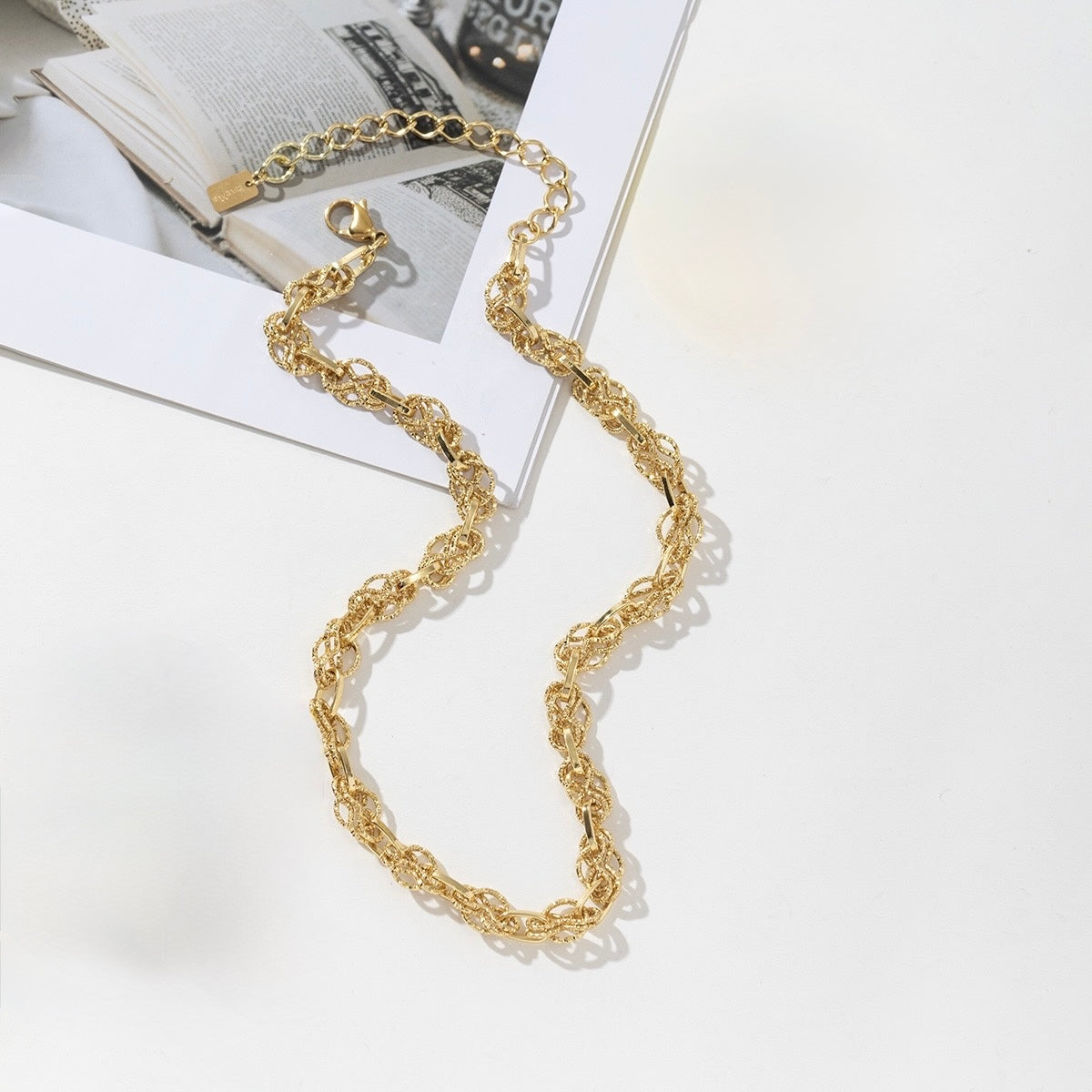 Optez pour l’élégance intemporelle avec ce collier en acier inoxydable doré, sublimé par une maille torsadée au rendu raffiné et féminin. Son design délicatement travaillé apporte du caractère tout en restant polyvalent, ce qui en fait la pièce idéale pour accompagner aussi bien vos tenues du quotidien que vos looks plus habillés.