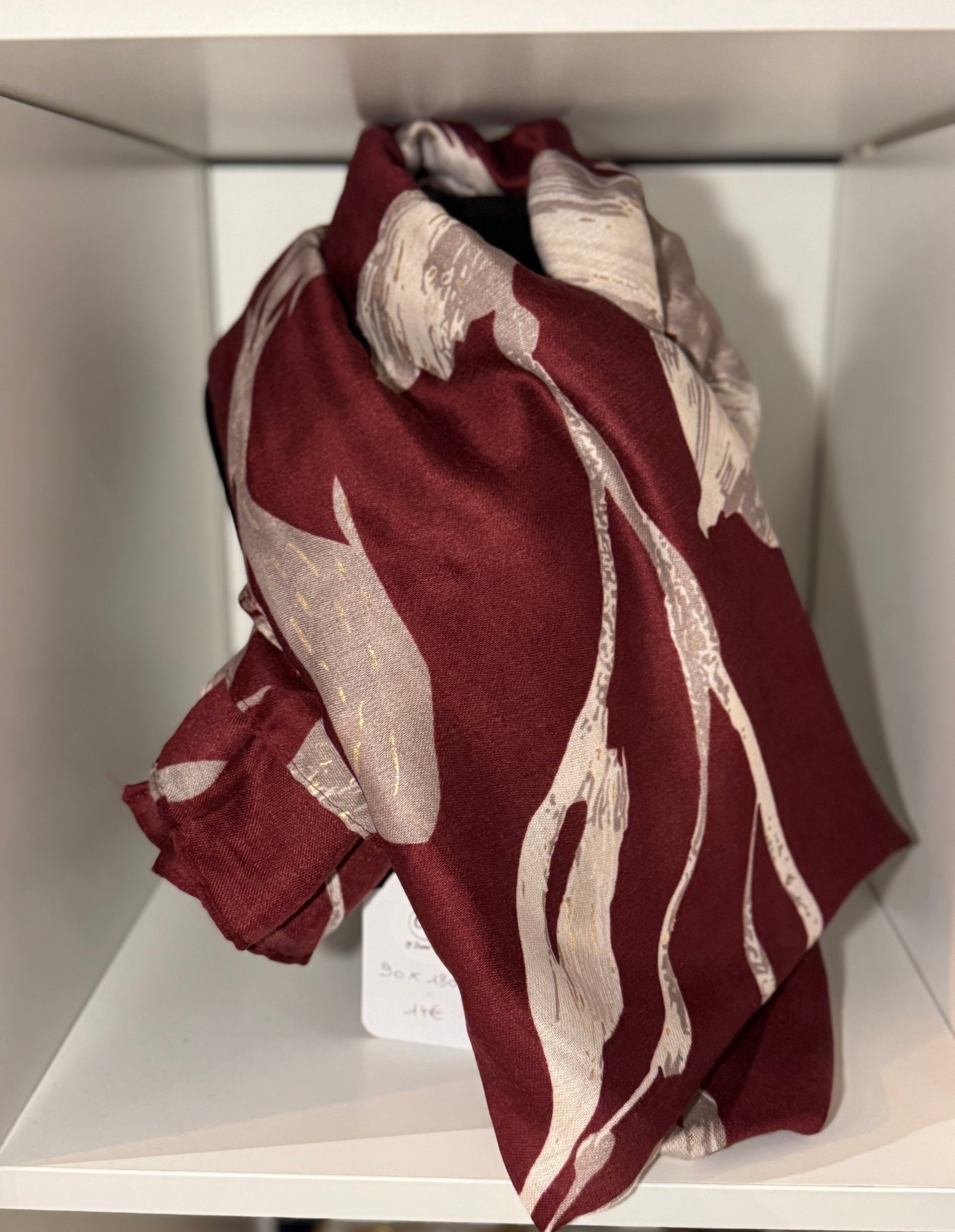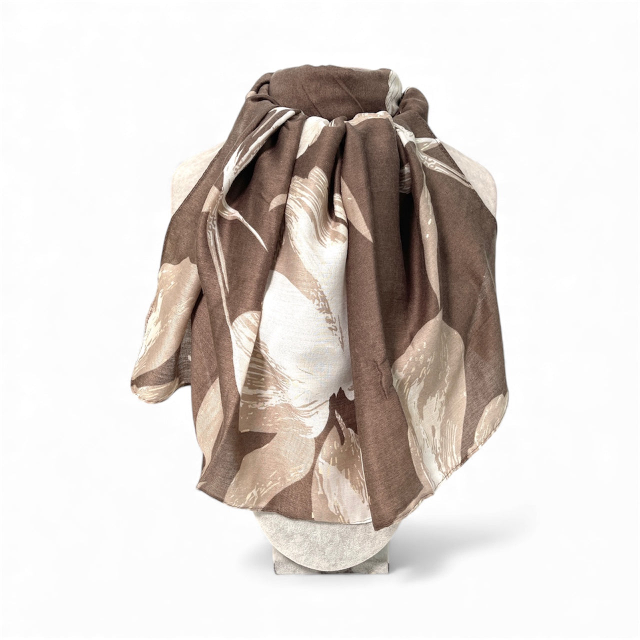Disponible en brun et en bordeaux, cette écharpe propose un motif floral délicat dans des tons harmonieux et élégants, parfaits pour compléter un manteau, un blazer ou une tenue plus casual. Sa grande taille 90×180 cm permet une multitude de styles : autour du cou, en étole ou même en châle pour un look sophistiqué.