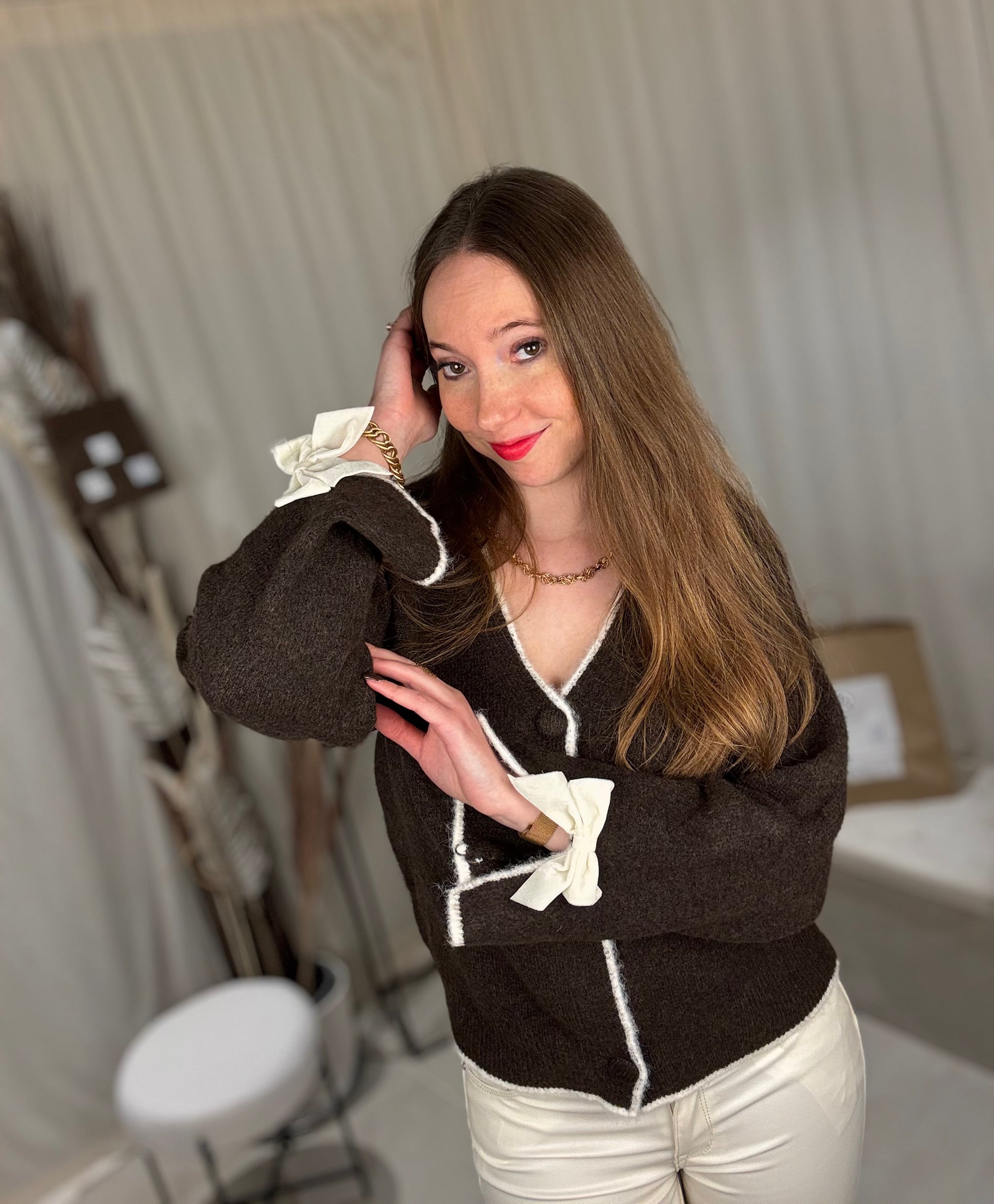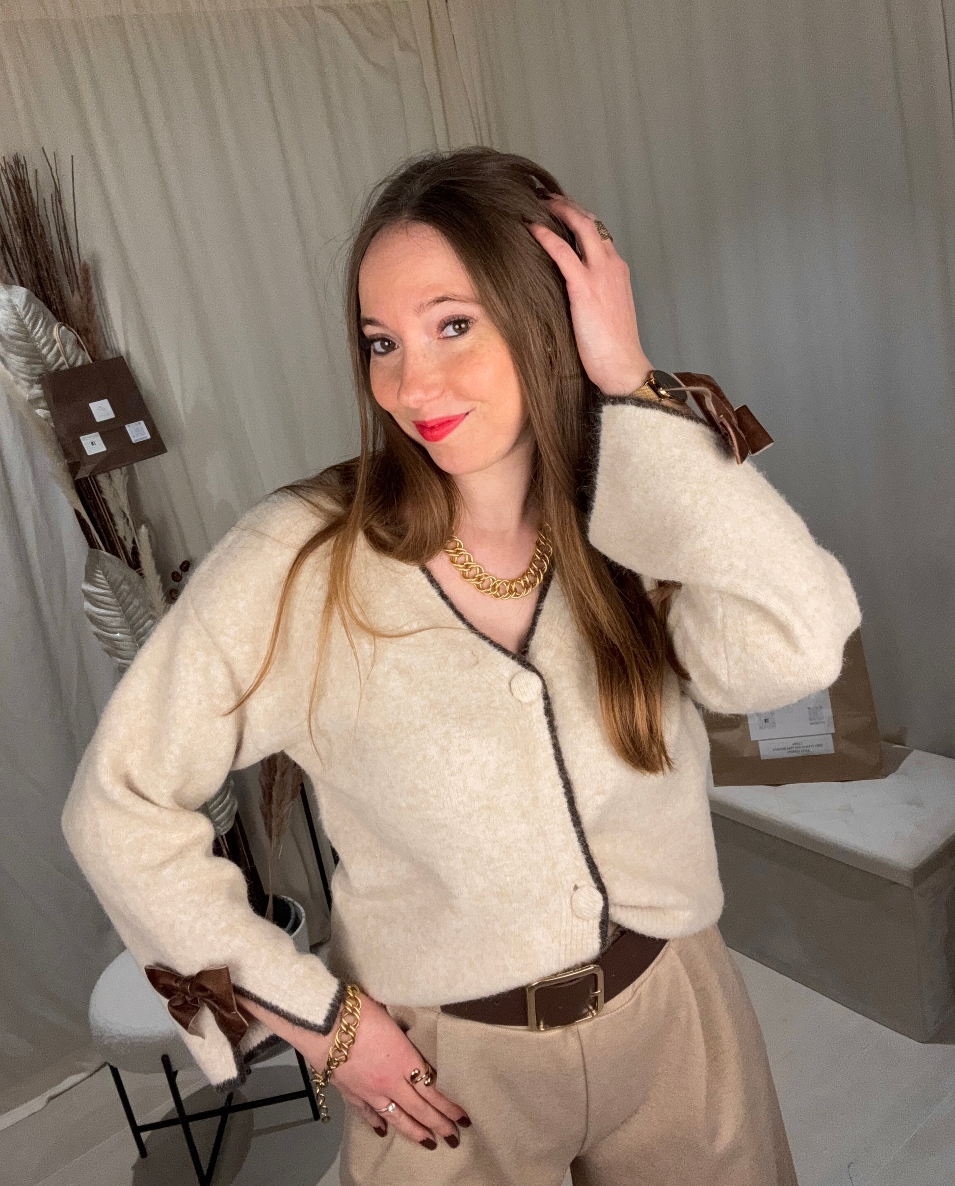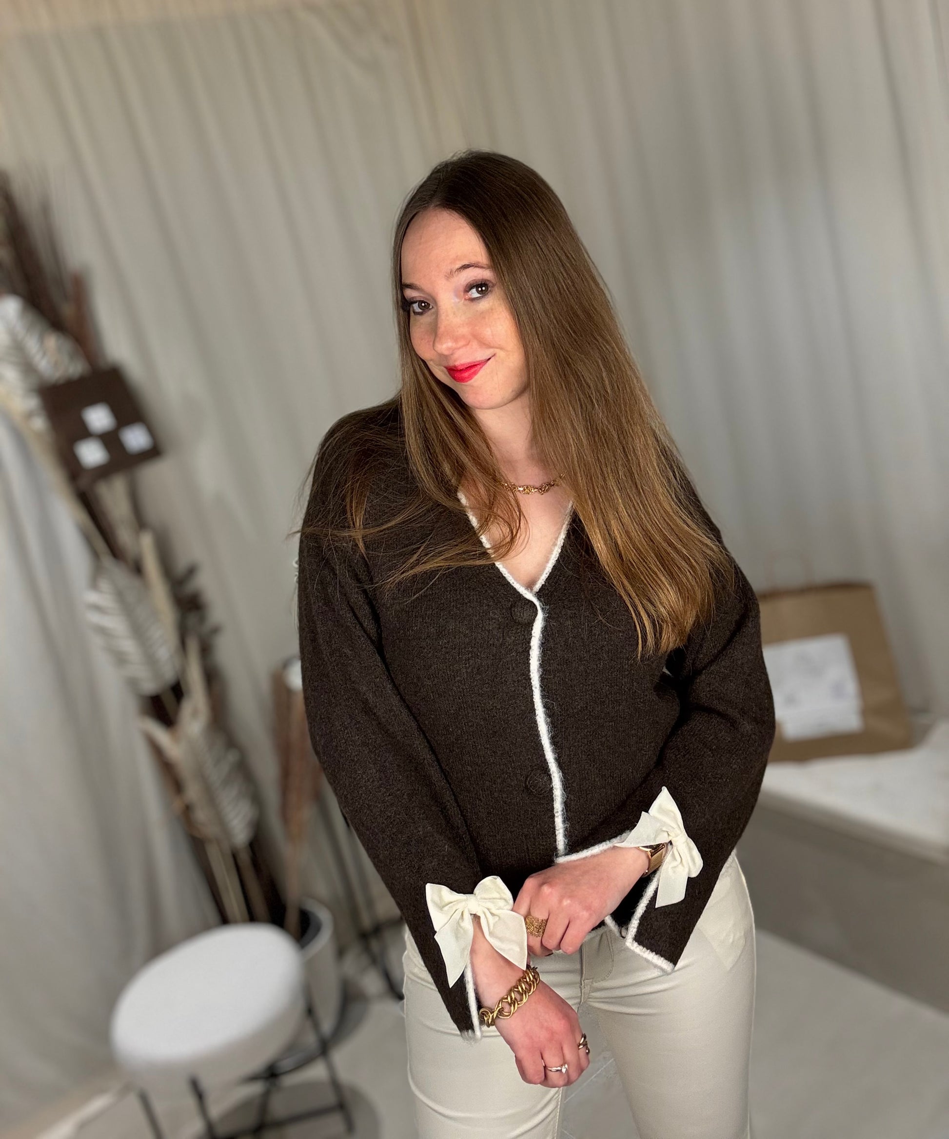 Laissez-vous séduire par notre gilet doux avec nœuds en velours, une pièce à la fois élégante, féminine et incroyablement confortable. Confectionné dans une maille moelleuse et chaude, ce gilet est idéal pour affronter les journées fraîches tout en gardant un style chic et raffiné.