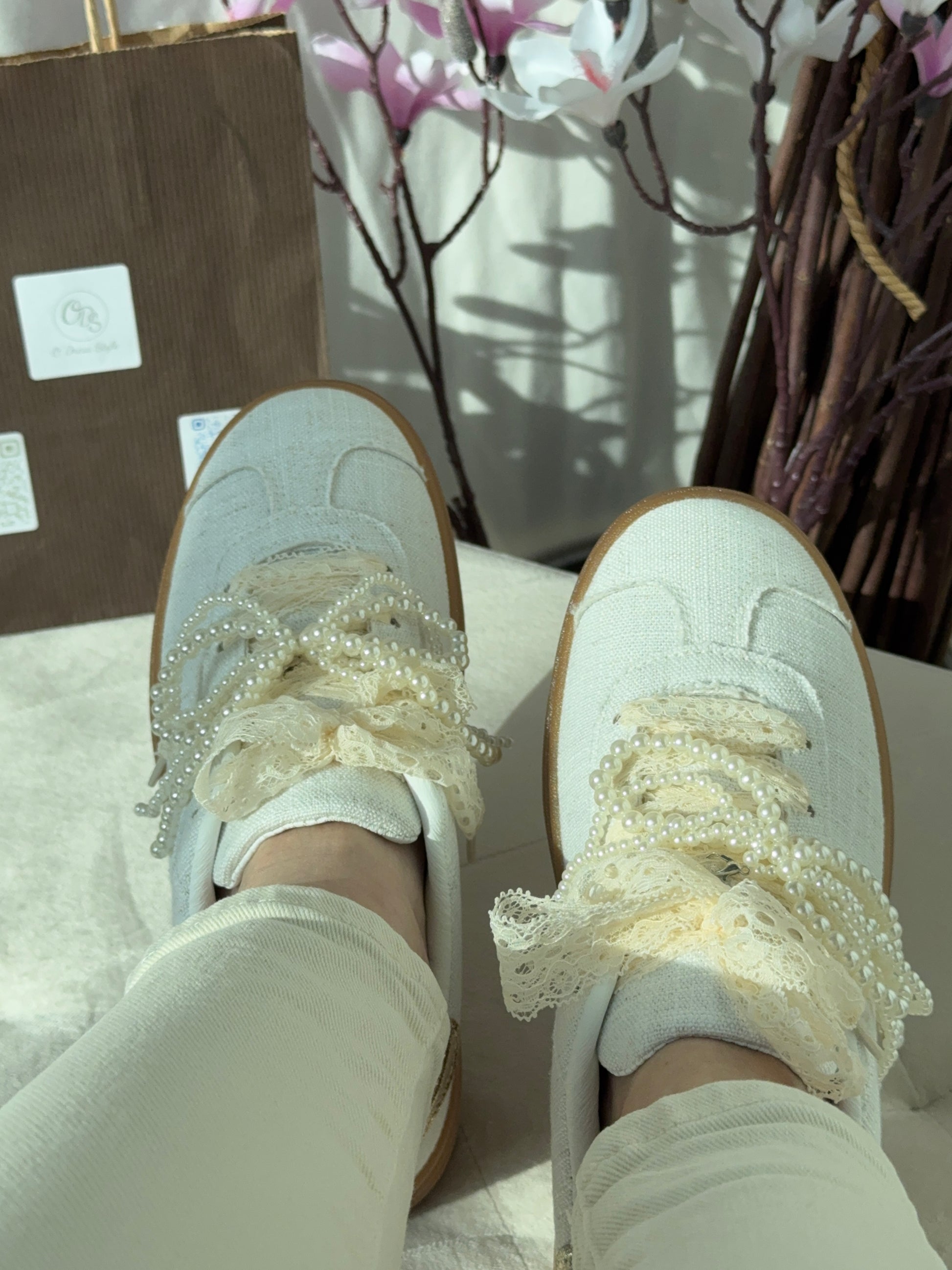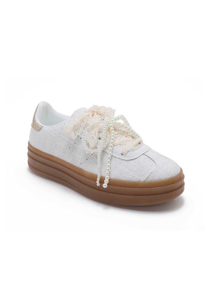 Craquez pour ces sneakers écru femme à lacets dentelle sublimées par un bijou en perles amovible délicatement travaillé.
